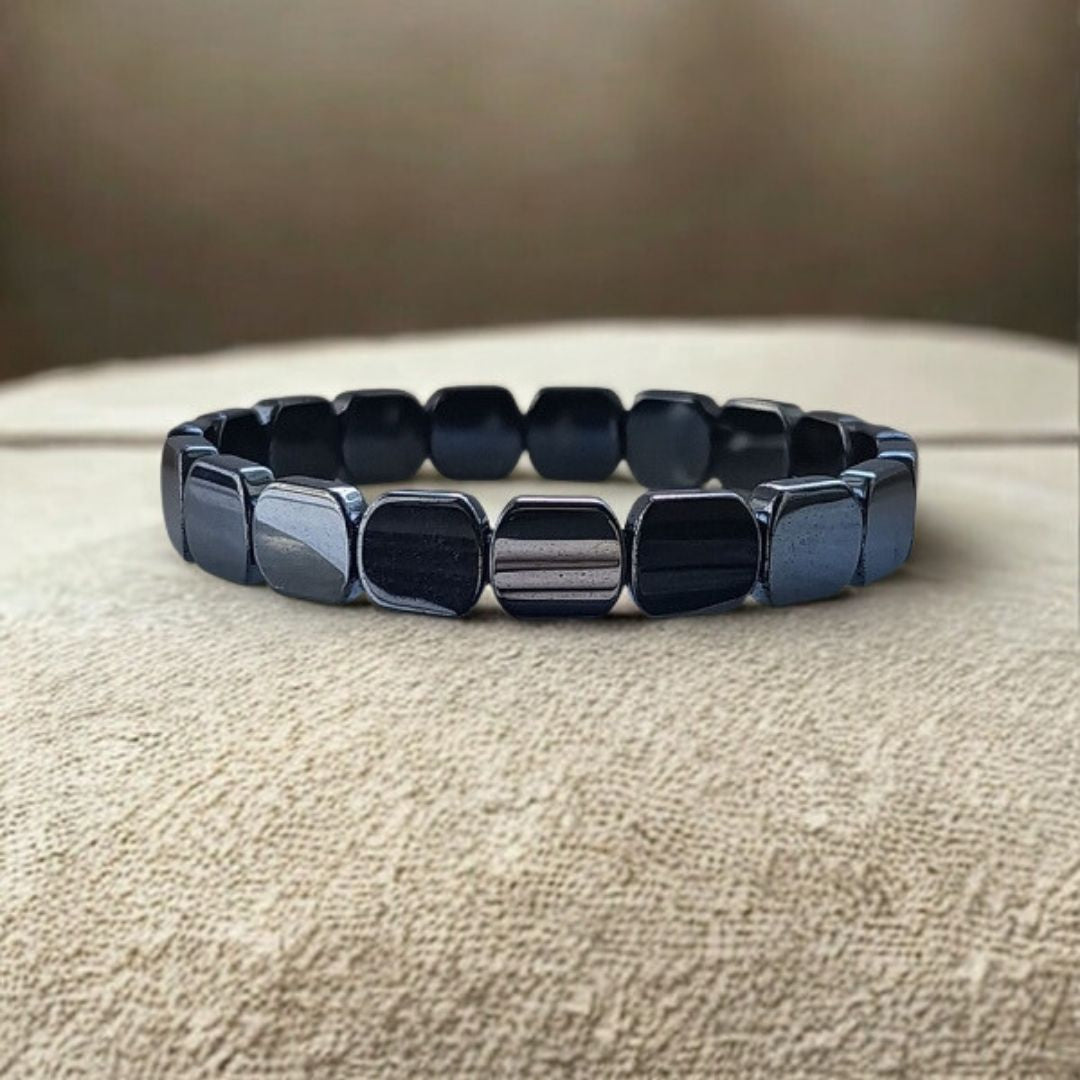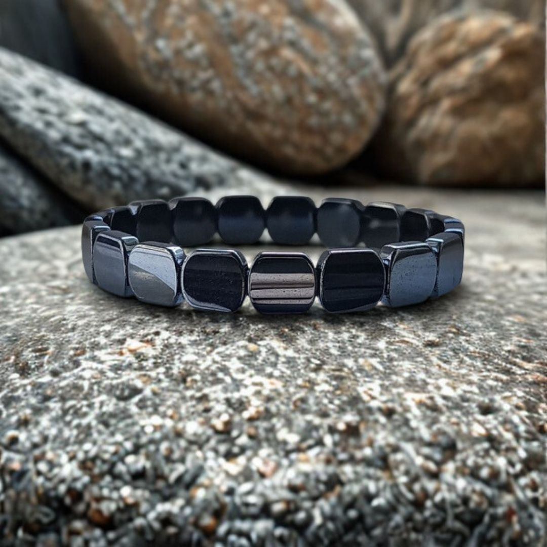Hematit Bilekliği, bir zamanlar savaşçılar tarafından topraklama ve canlandırıcı etkileri nedeniyle saygı duyulan manyetik bir taş olan hematitin kadim gücünü yansıtıyor.